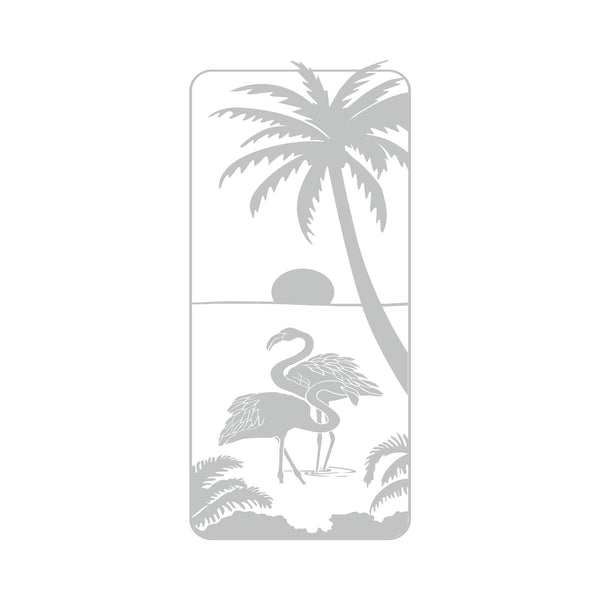 Bring tropical elegance to your bathroom with our beautiful Flamingos & Palm Tree Etched Vinyl Decal. This stunning full-panel design showcases two graceful flamingos beneath a swaying palm tree with a sunset backdrop, creating a serene island escape right in your home.